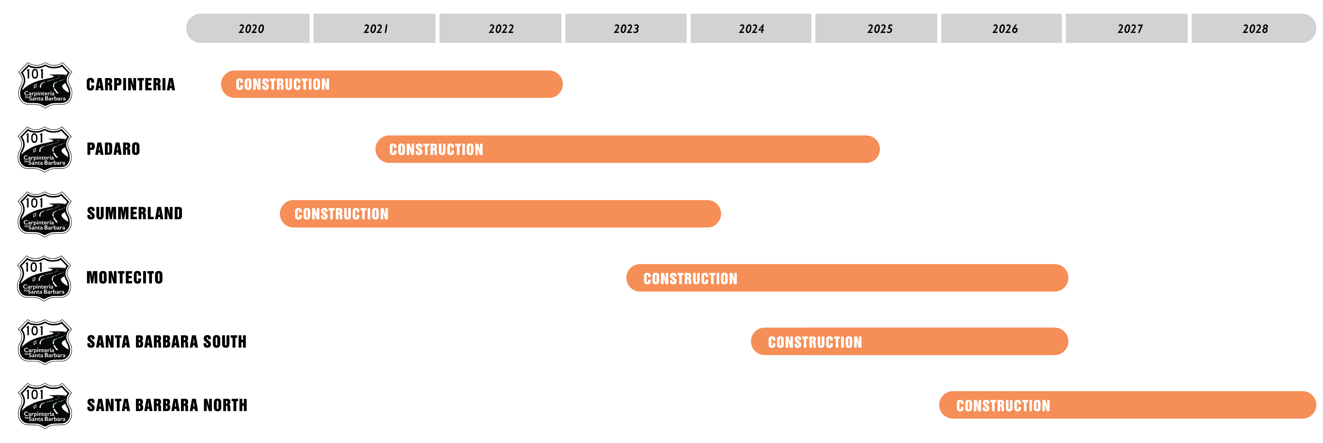 Between Santa Barbara and Mussel Shoals, Highway 101 is being expanded to include new carpool lanes and operational improvements. The phases are color coded above.